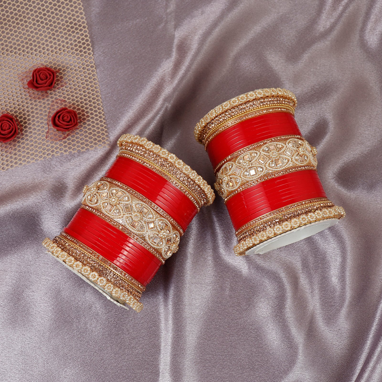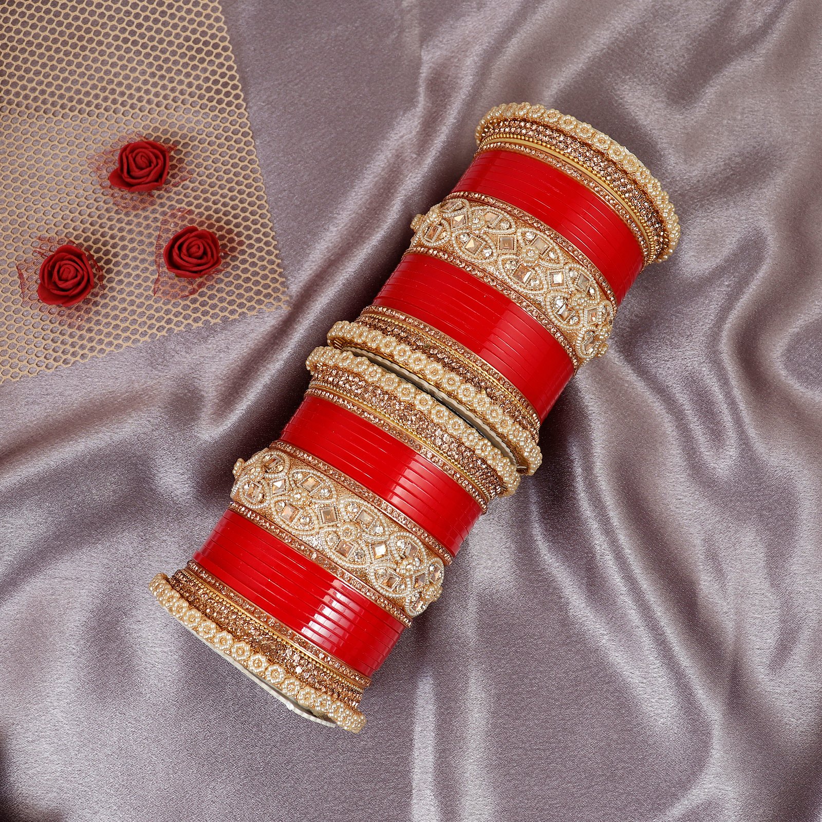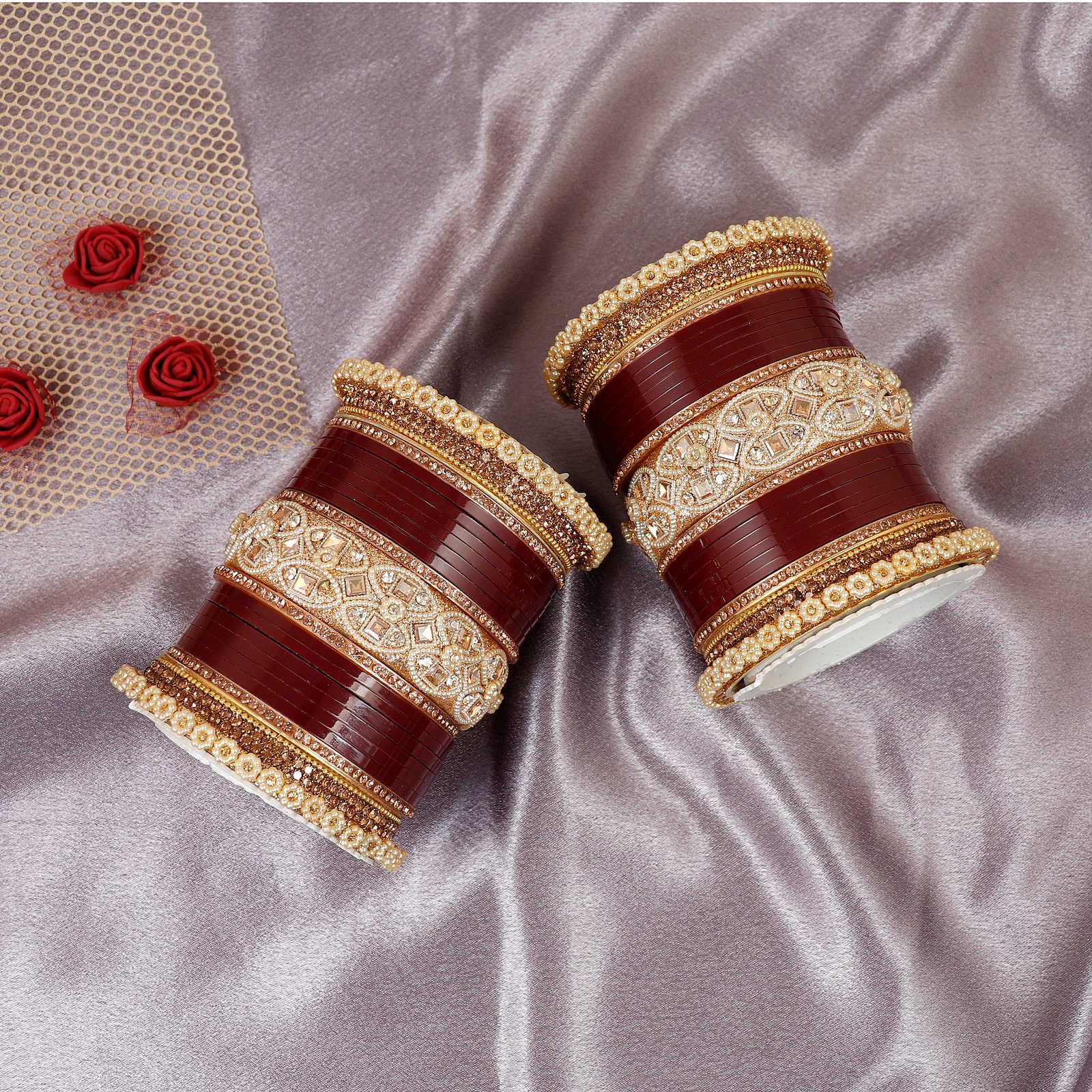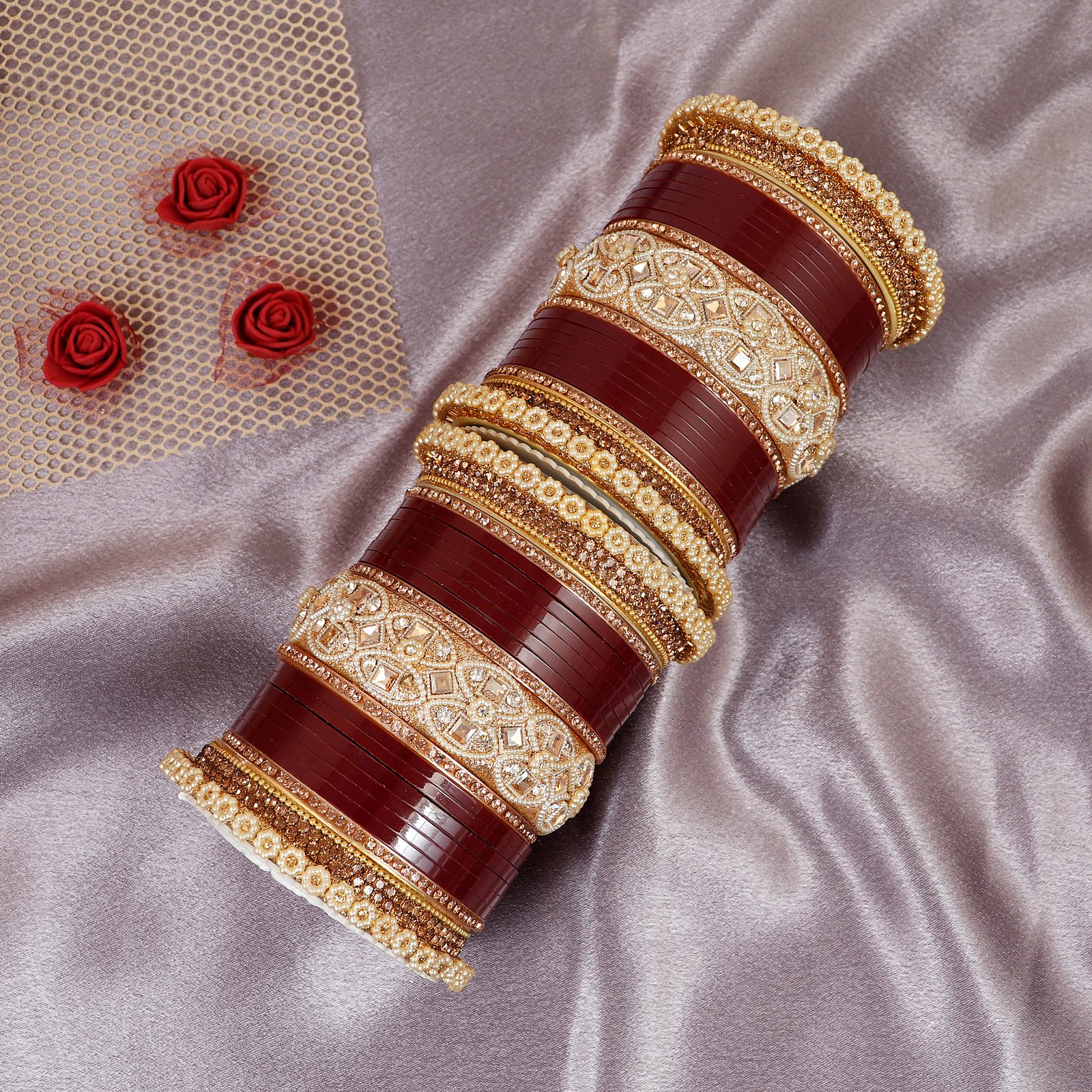 Featuring rich bangles combined with sparkling stones and golden detailing, this Chuda is perfect for weddings, bridal wear, and special occasions.